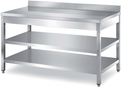 Стол производственный открытый, с бортом H85мм (толщиной 15мм), 6 ножками, 2 нижними сплошными полками, столешницей с подложкой из ЛДСП и нержавеющей стали имеет сборно-разборную конструкцию и изготовлен из нержавеющей стали 304 с покрытием Scotch Brite. Регулируемые по высоте ножки изготовлены из квадратной трубы сечением 40х40мм. Опоры ножек регулируются по высоте в пределах 60мм и снабжены пластиковой подложкой для предотвращения скольжения по полу.